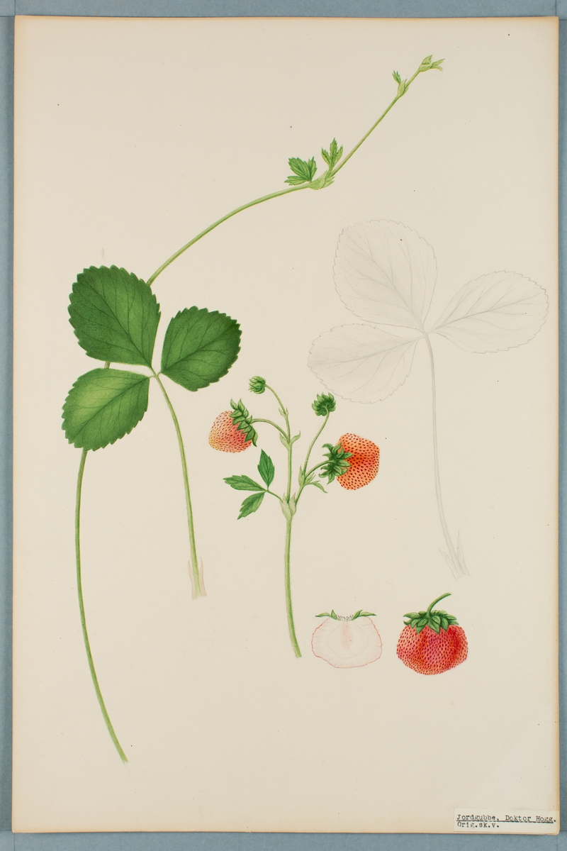 Sveriges kulturväxter. Illustration utförd av Henriette Sjöberg. Jordgubbe, Doktor Hogg. Odlingsplats och datering saknas. Nr. 42. Signerad.