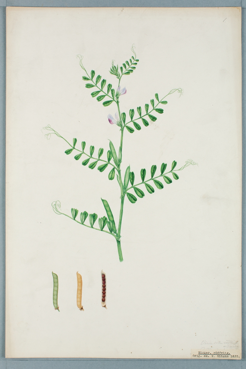Sveriges kulturväxter. Illustration utförd av Henriette Sjöberg. Rödfröig vicker. Odlad Ultuna 1872. Inv. nr. C101 : 555.