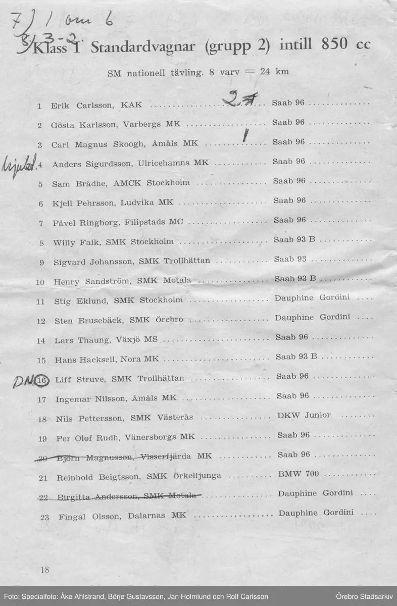 Deltagarlista. Gelleråsen, Karlskoga. 1960-08-07