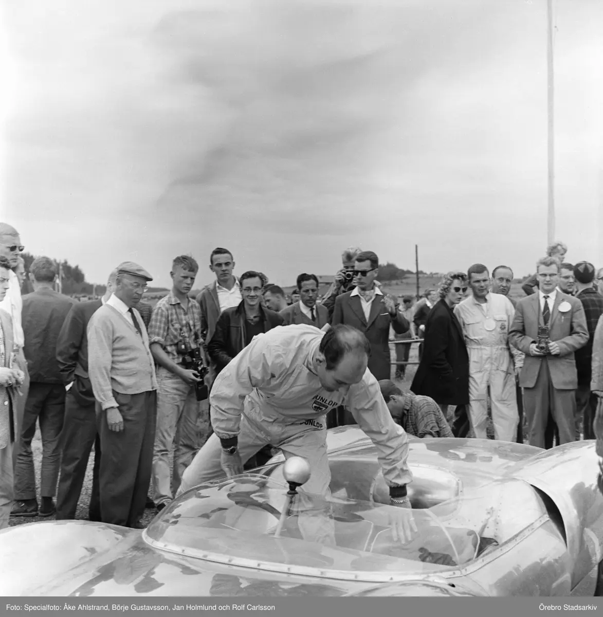 Moss kliver in i sin Lotus. Gelleråsen, Karlskoga. 1960-08-07