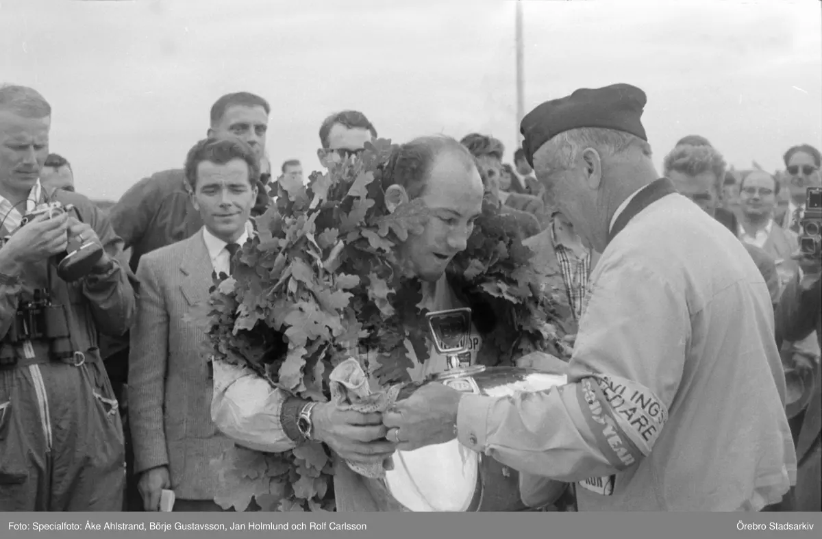 Moss tar emot segerbucklan. Gelleråsen, Karlskoga. 1960-08-07
