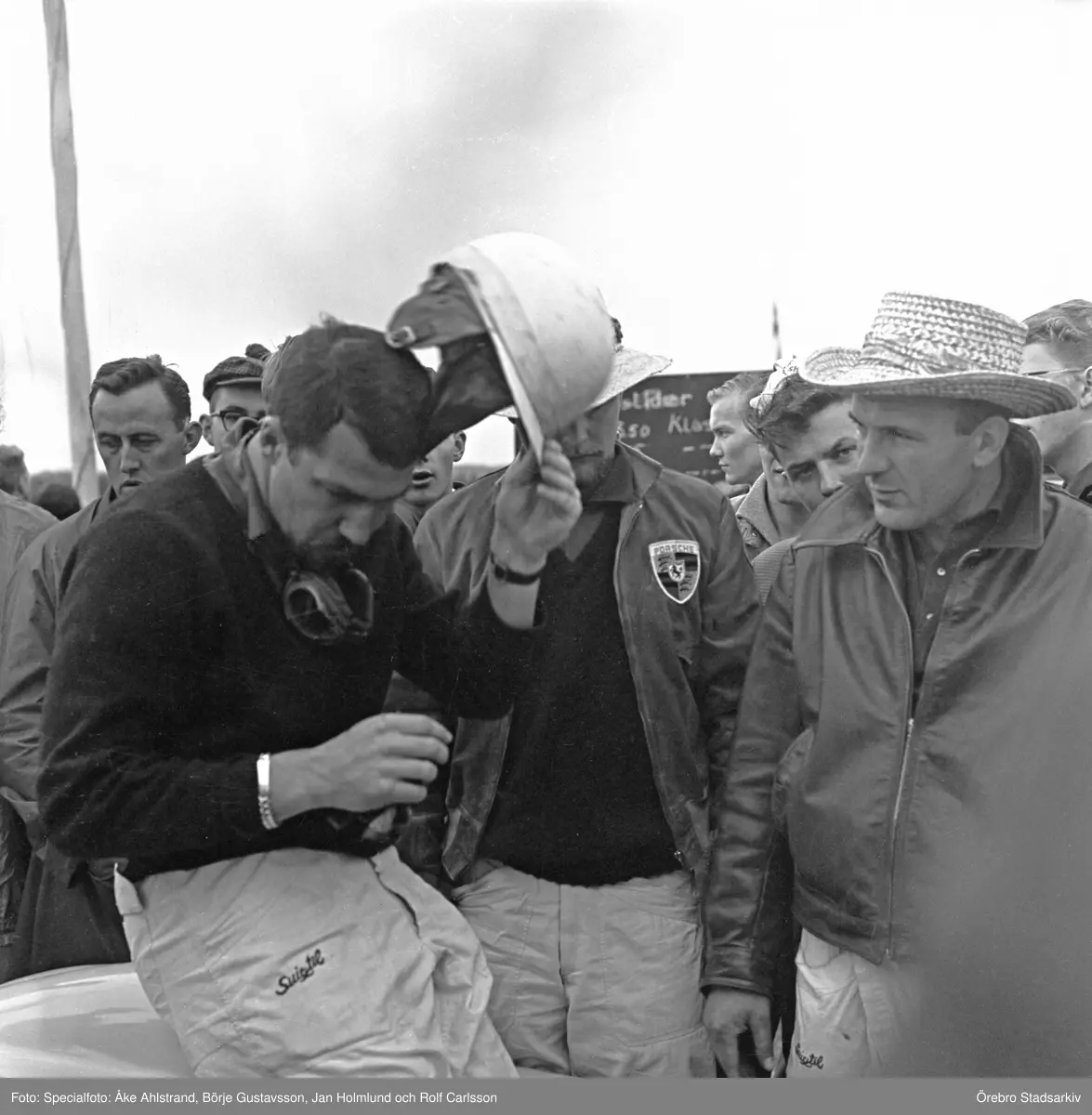 Bonnier tar på sig störtkrukan. Gelleråsen, Karlskoga. 1960-08-07