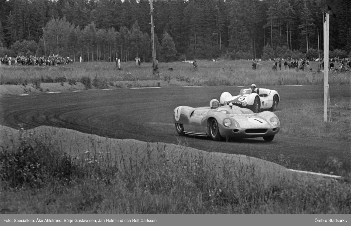 Bonnier skuggar Stirling Moss. Gelleråsen, Karlskoga. 1960-08-07