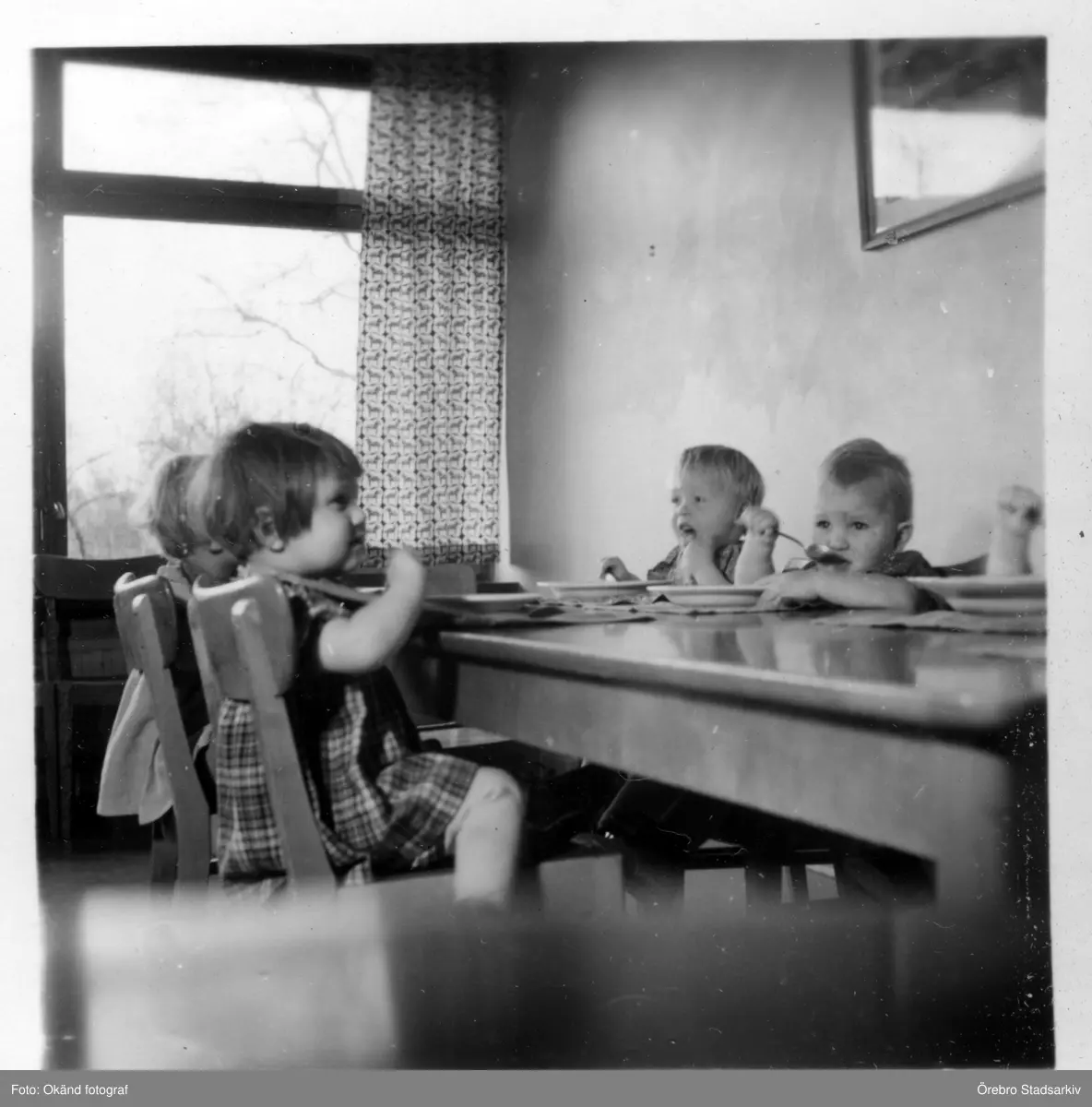 Barn äter vid matbord på Stentorpsvägen, 1950-tal