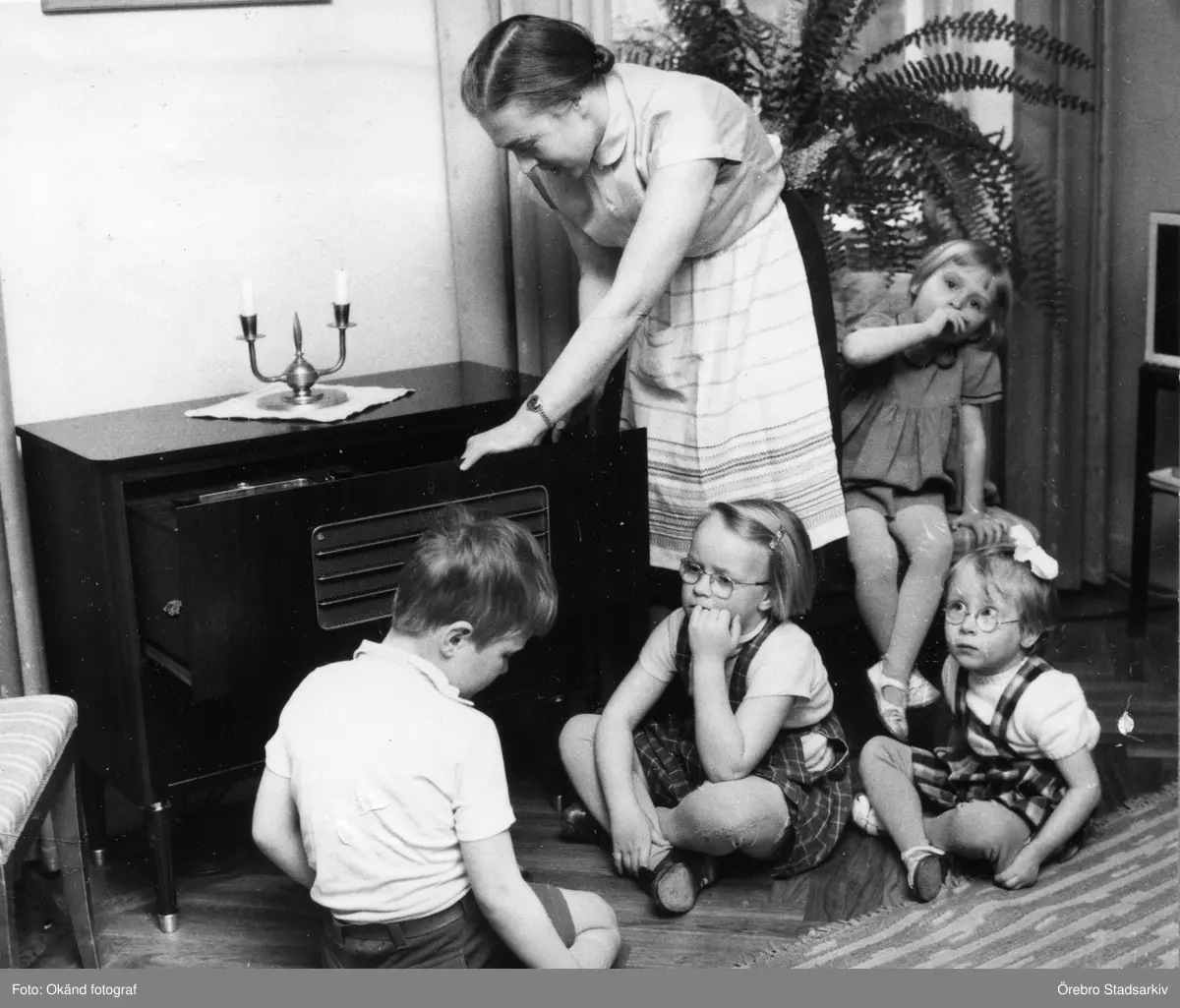 Barn lyssnar på radio på Stentorpsvägen, 1950-tal