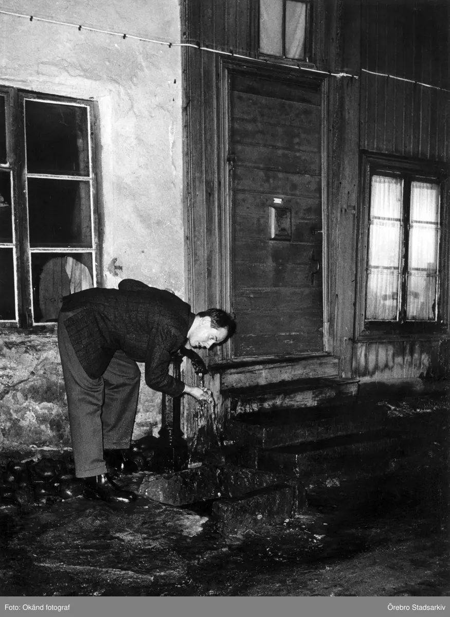 Man dricker från vattenpump., 1950-1958