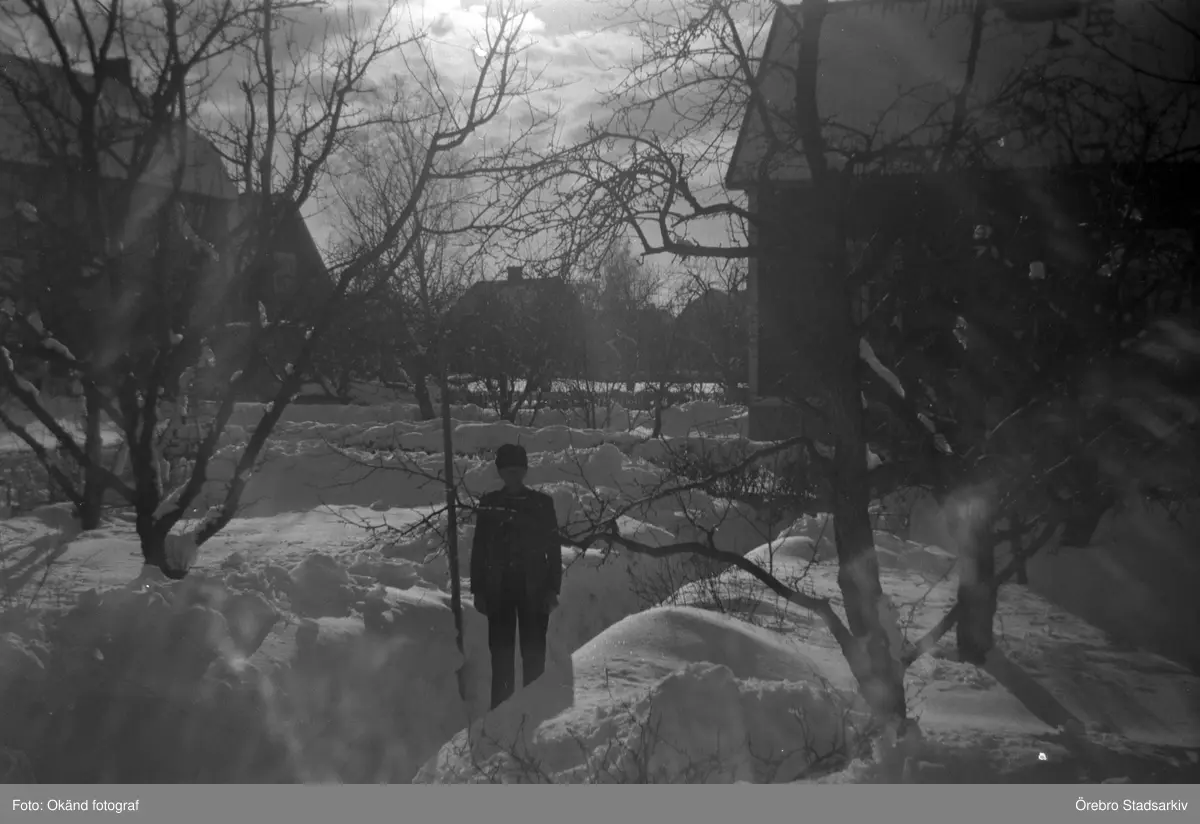 Man mellan snövallar i Rynninge, 1940-tal