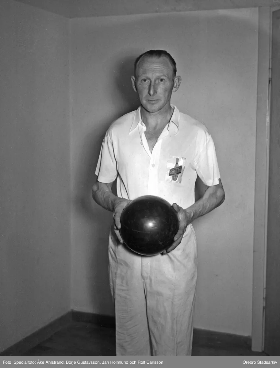 Man från BK Fight poserar med bowlingklot i Örebro bowlinghall, 1947-10-30