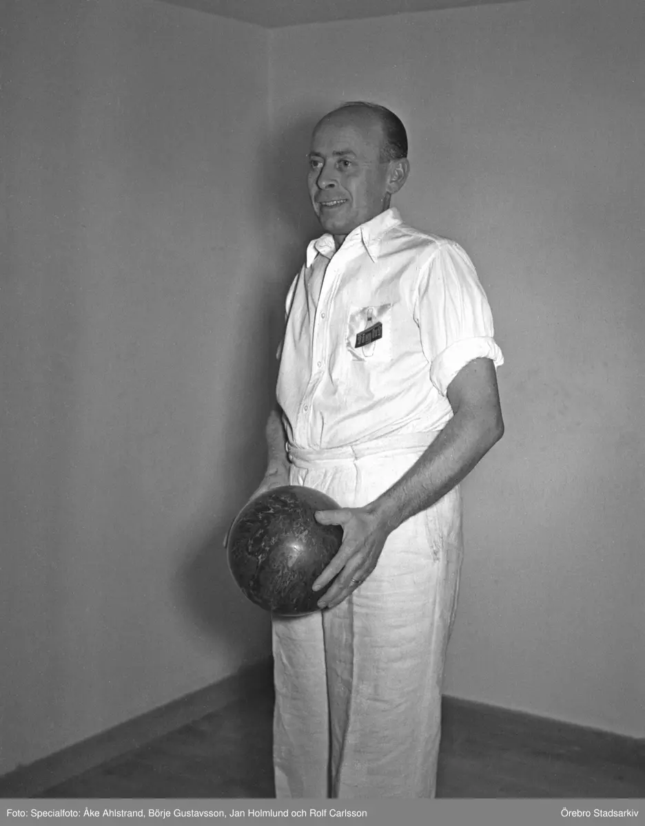 Man från BK Fight med bowlingklot i Örebro bowlinghall, 1947-10-30