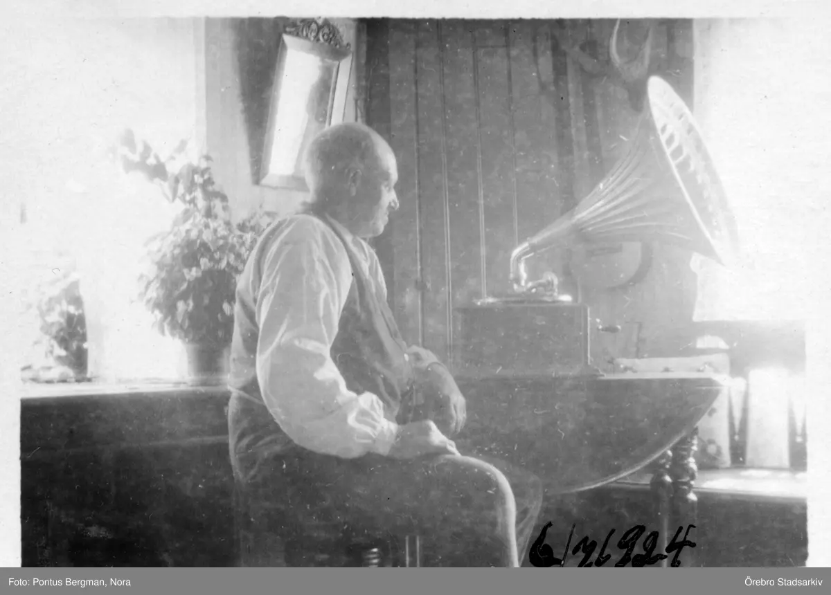 Äldre man vid trattgrammofon i Nora, 1924