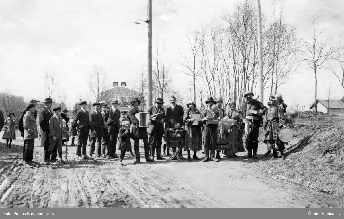 Utklädda spelemän vid landsvägen i Nora, 1923
