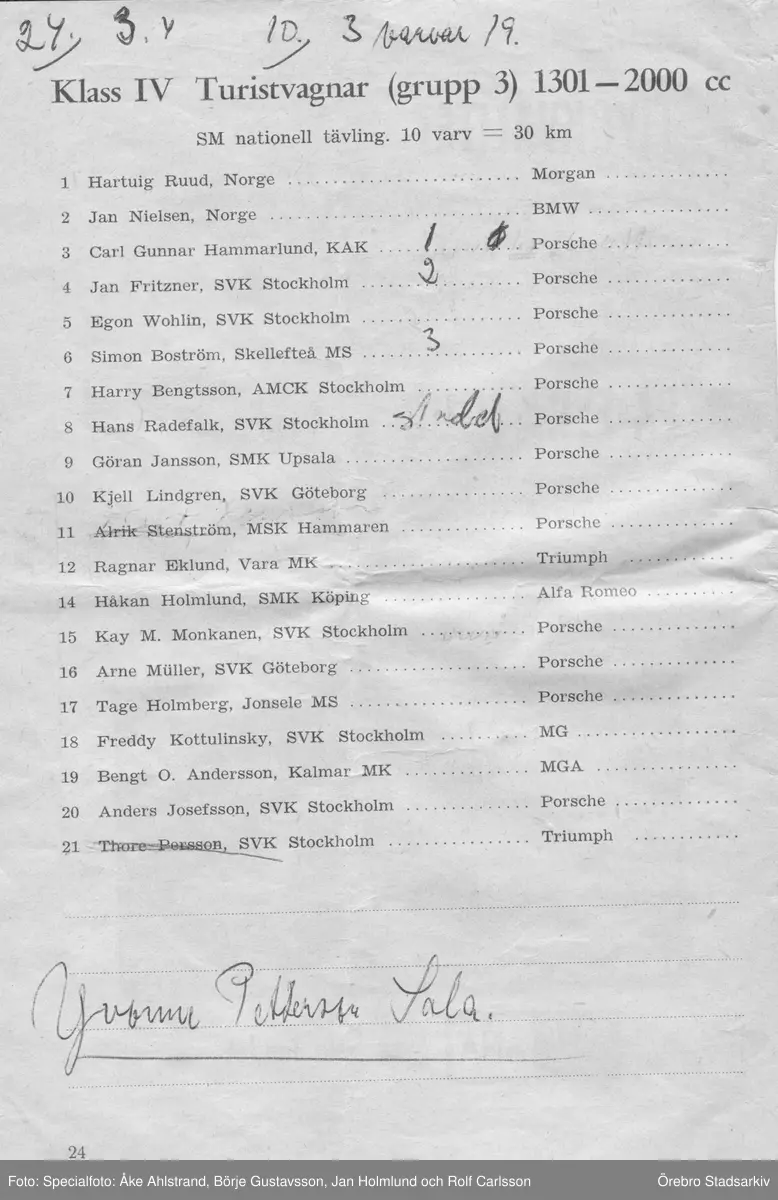 Deltagarlista. Gelleråsen, Karlskoga. 1960-08-07