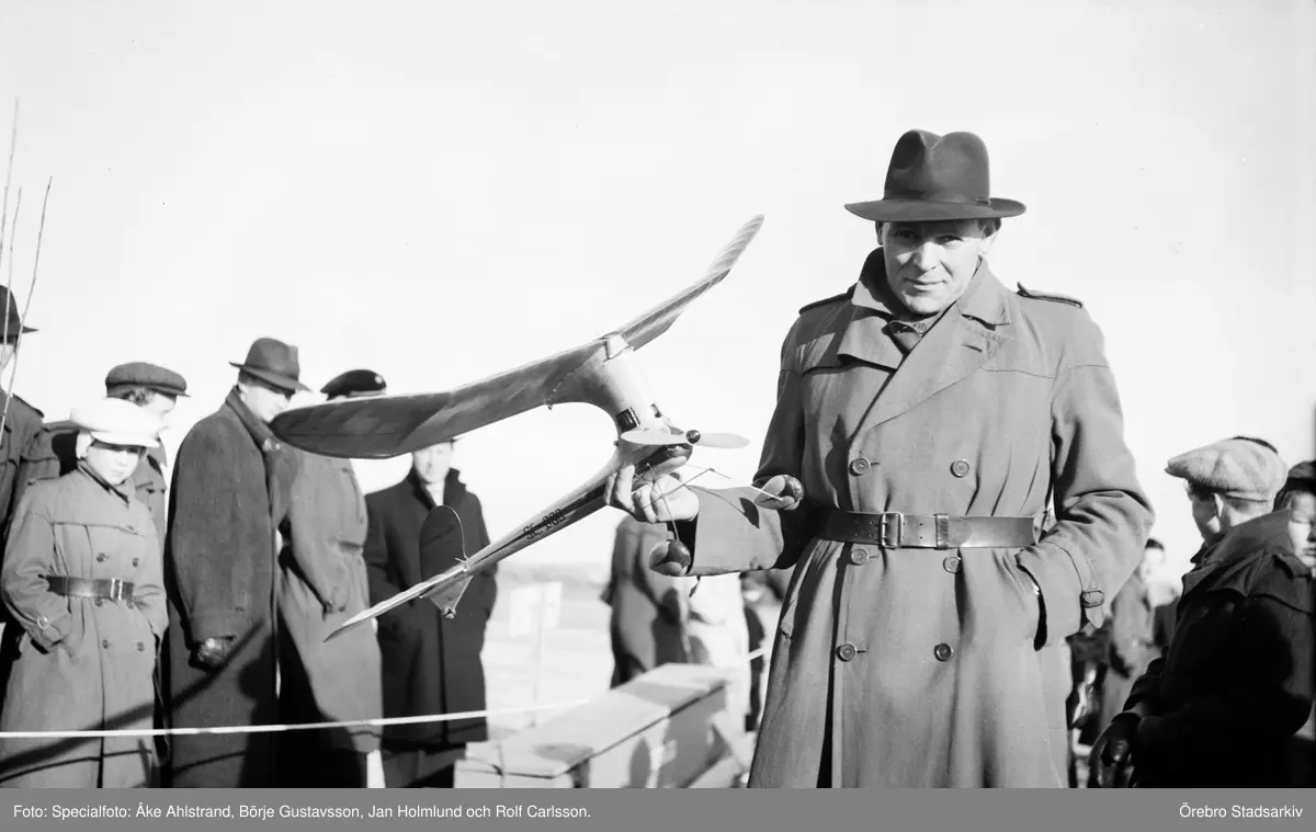 Man visar sitt modellflygplan på Gustavsviks flygfält, maj 1946