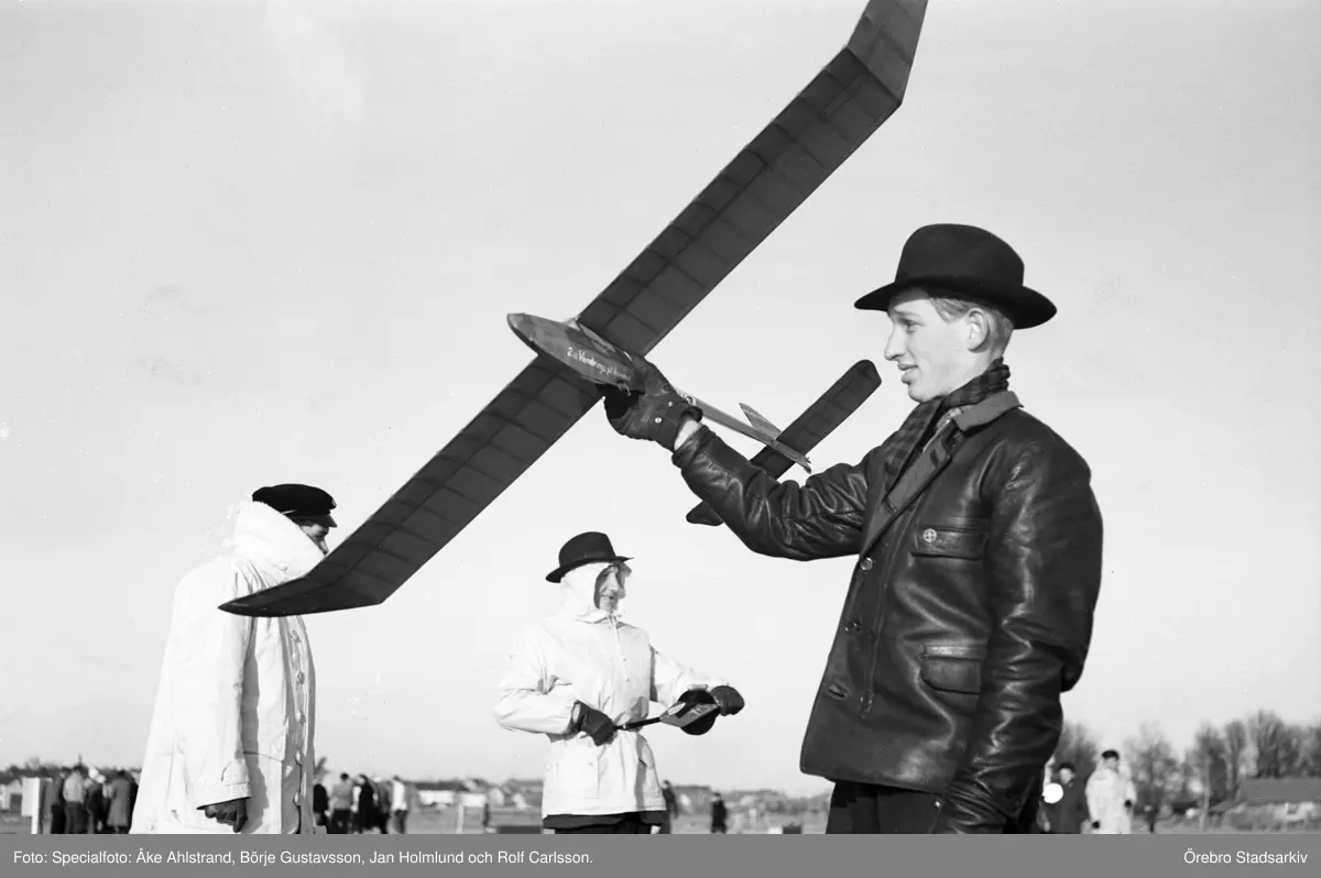 Man med modellflygplan på Gustavsviks flygfält, maj 1946