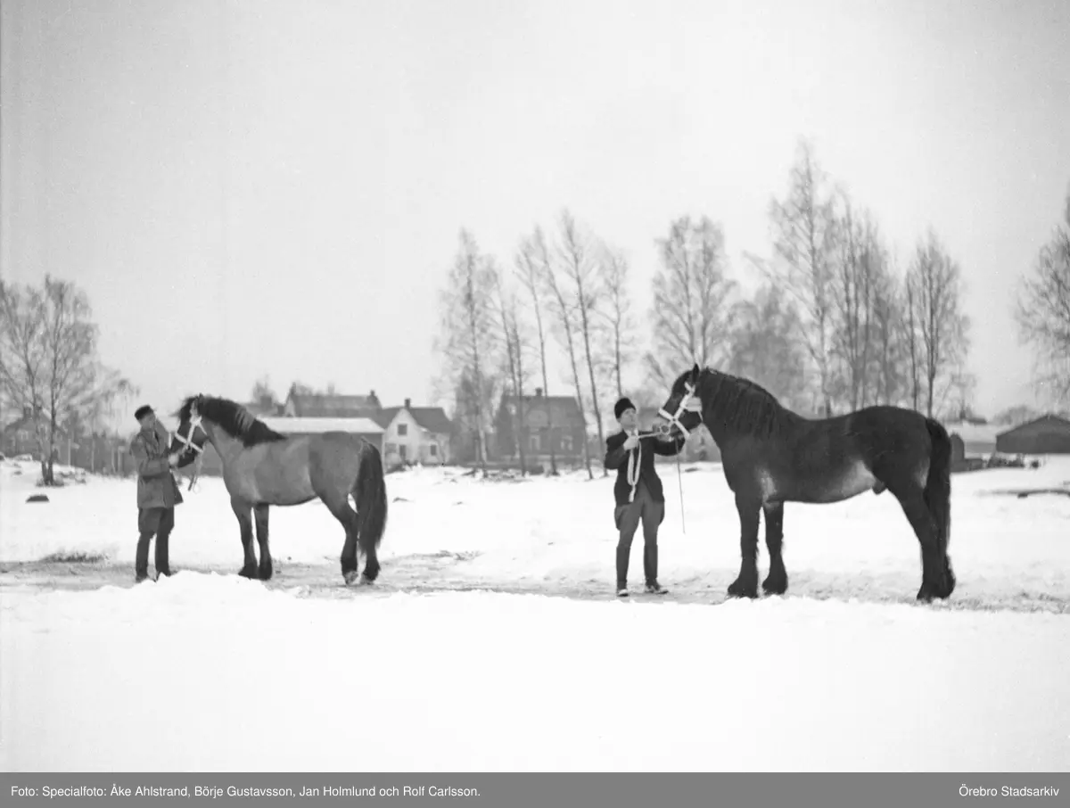 Två nordsvenska hingstar visas upp vid hingstpremiering i Örebro, 1946-03-05
