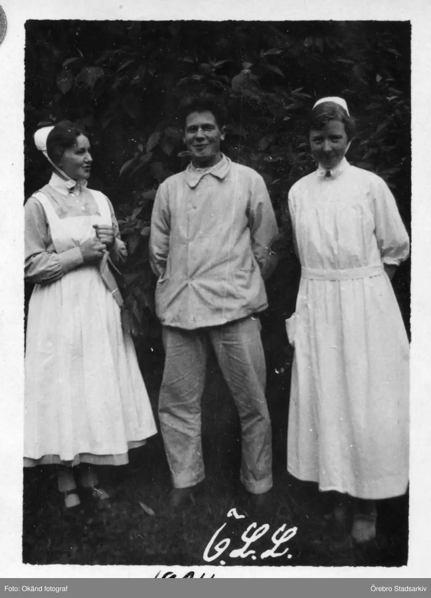 Patient med sköterskor på Örebro Centrallasarett, Grev Rosengatan, 1924