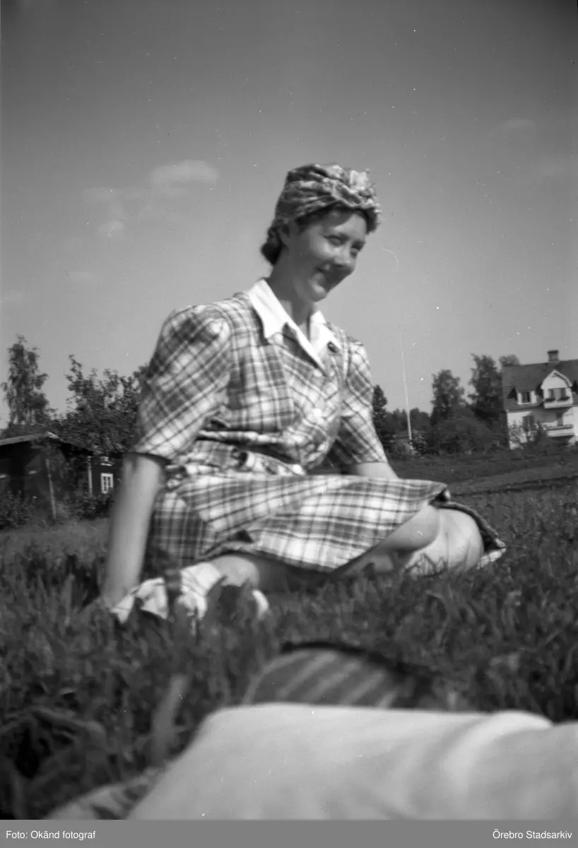 Kvinna på gräsmatta i Stora Mellösa, 1930-tal