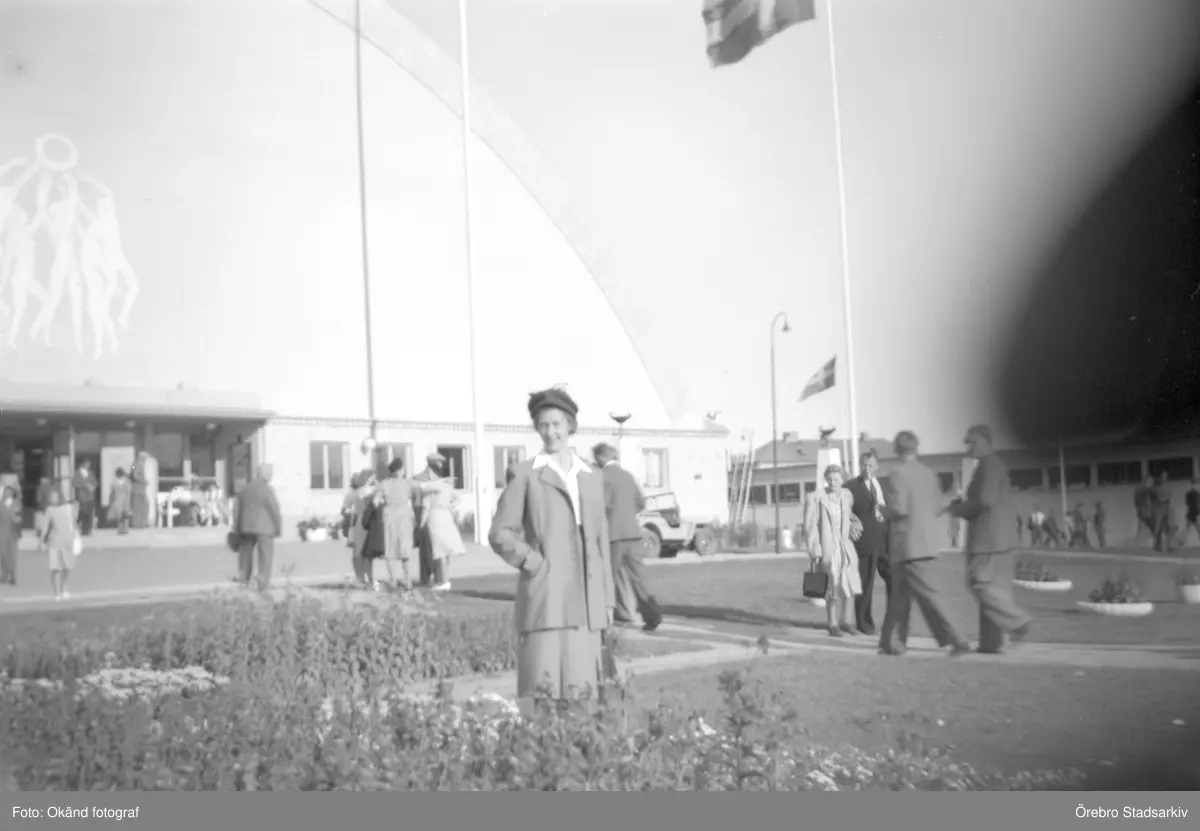 Kvinna utanför Idrottshuset på Örebroutställningen 1947