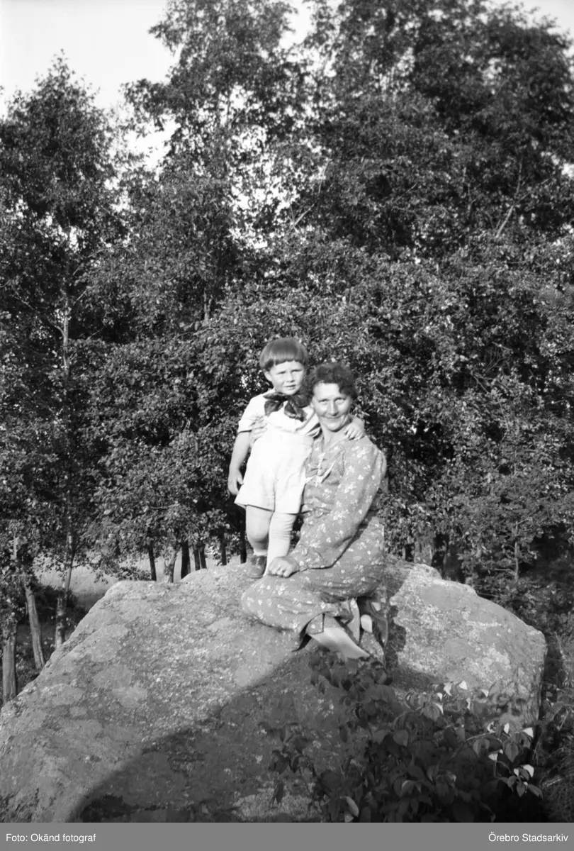 Kvinna och barn på sten I Stora Mellösa, 1930-tal