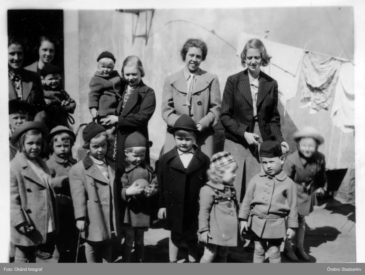 Grupp vid husvägg på Olaigatan, 1940-tal