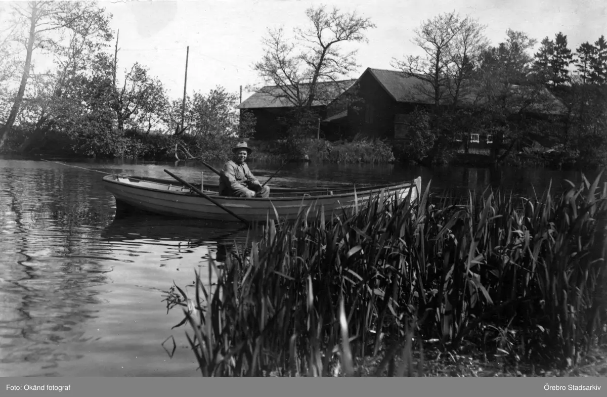 Fiskare i eka bakom vass i Kvarndammen i Klockhammar, 1910-tal