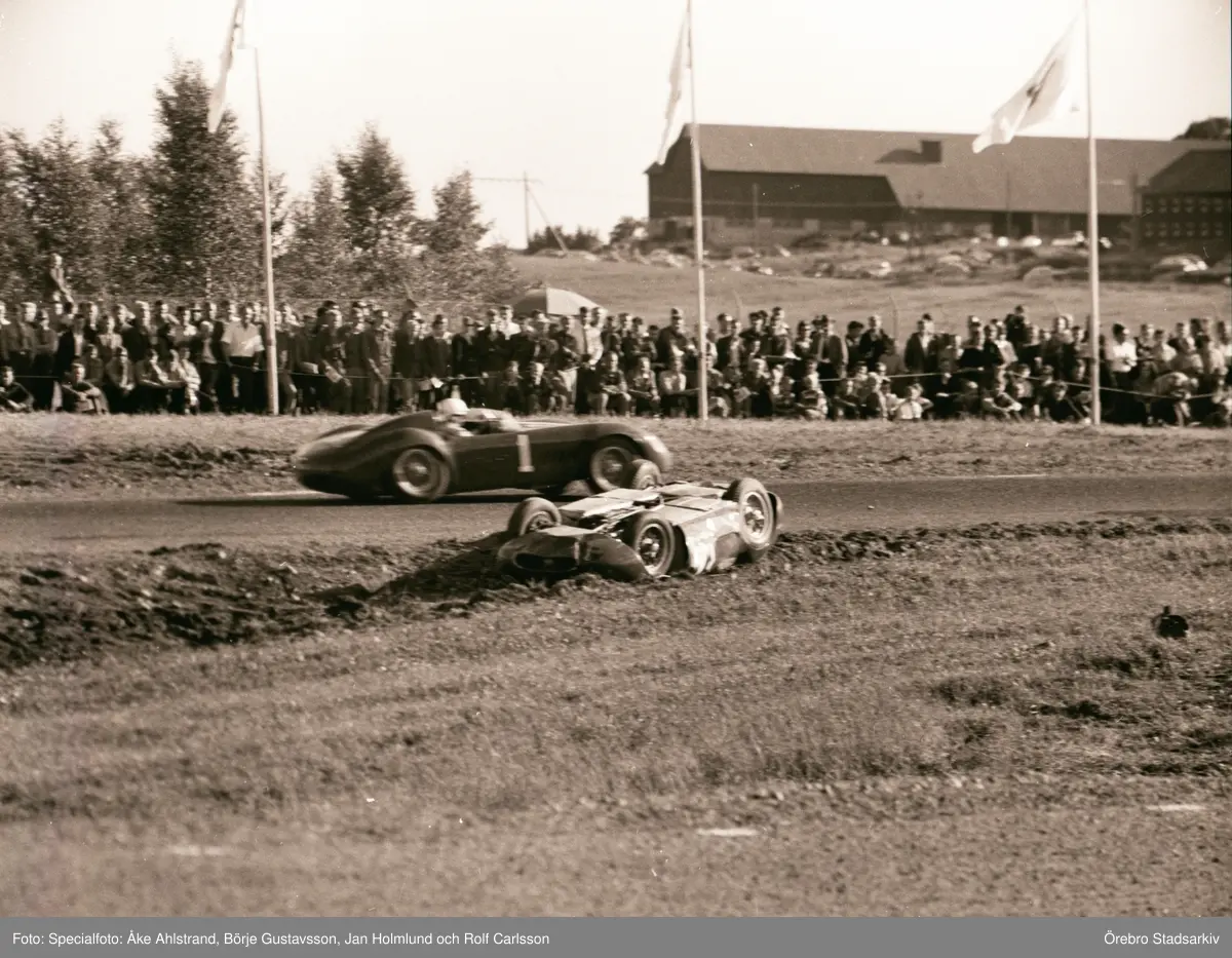 Moss passerar Bonniers bilvrak. Gelleråsen, Karlskoga. 1958-08-10