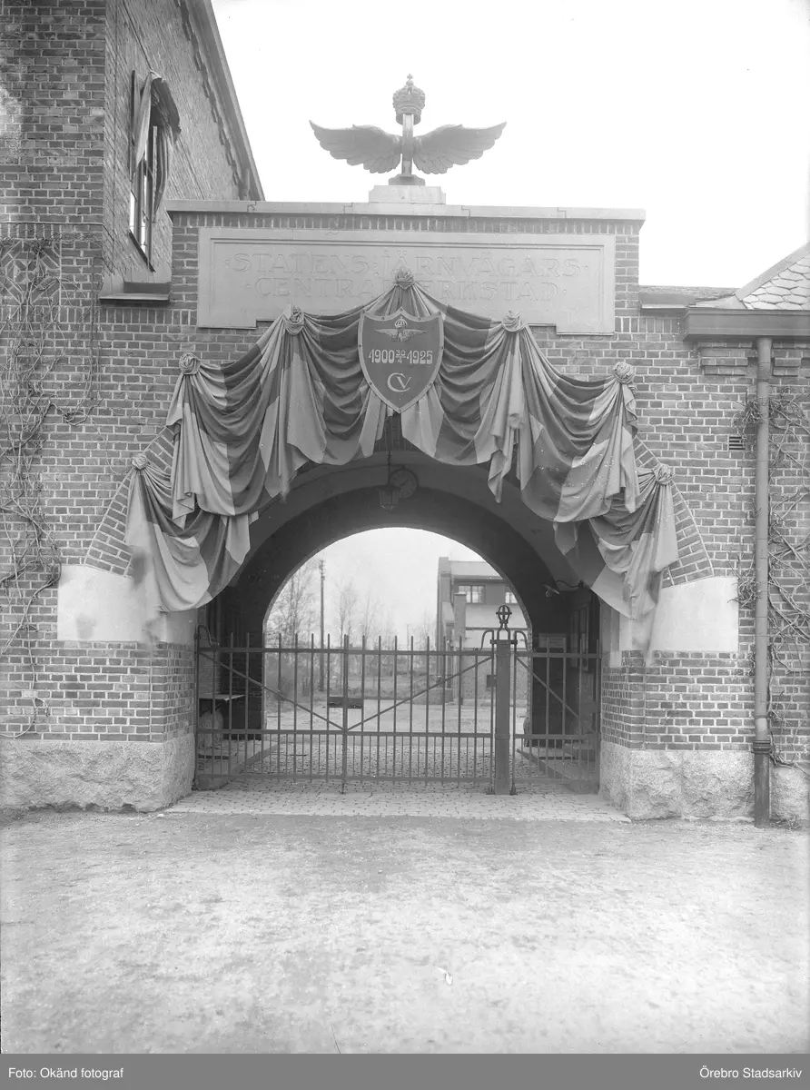 Porten vid Centralverkstäderna dekorerad till 25 års jubileum, 1925-04-30
