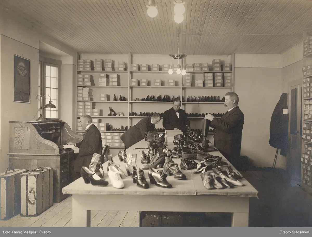 Reseförsäljare packar skor på Marks skofabrik, 1915