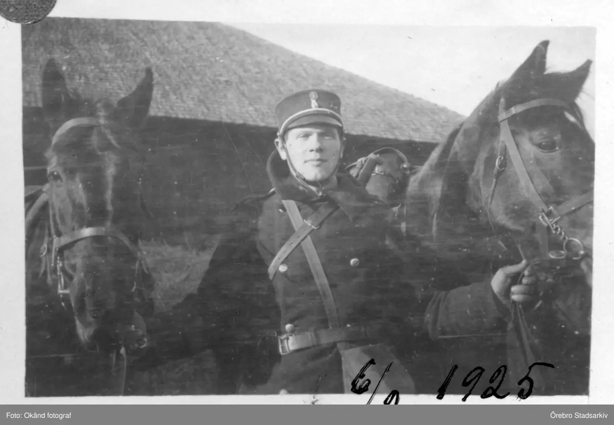 Värnpliktig med hästar på Svea Trängkår, Älvtomtagatan, 1924