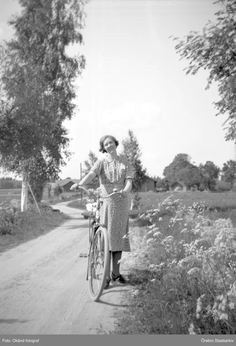 Kvinna med cykel på landsväg i Stora Mellösa, 1930-tal