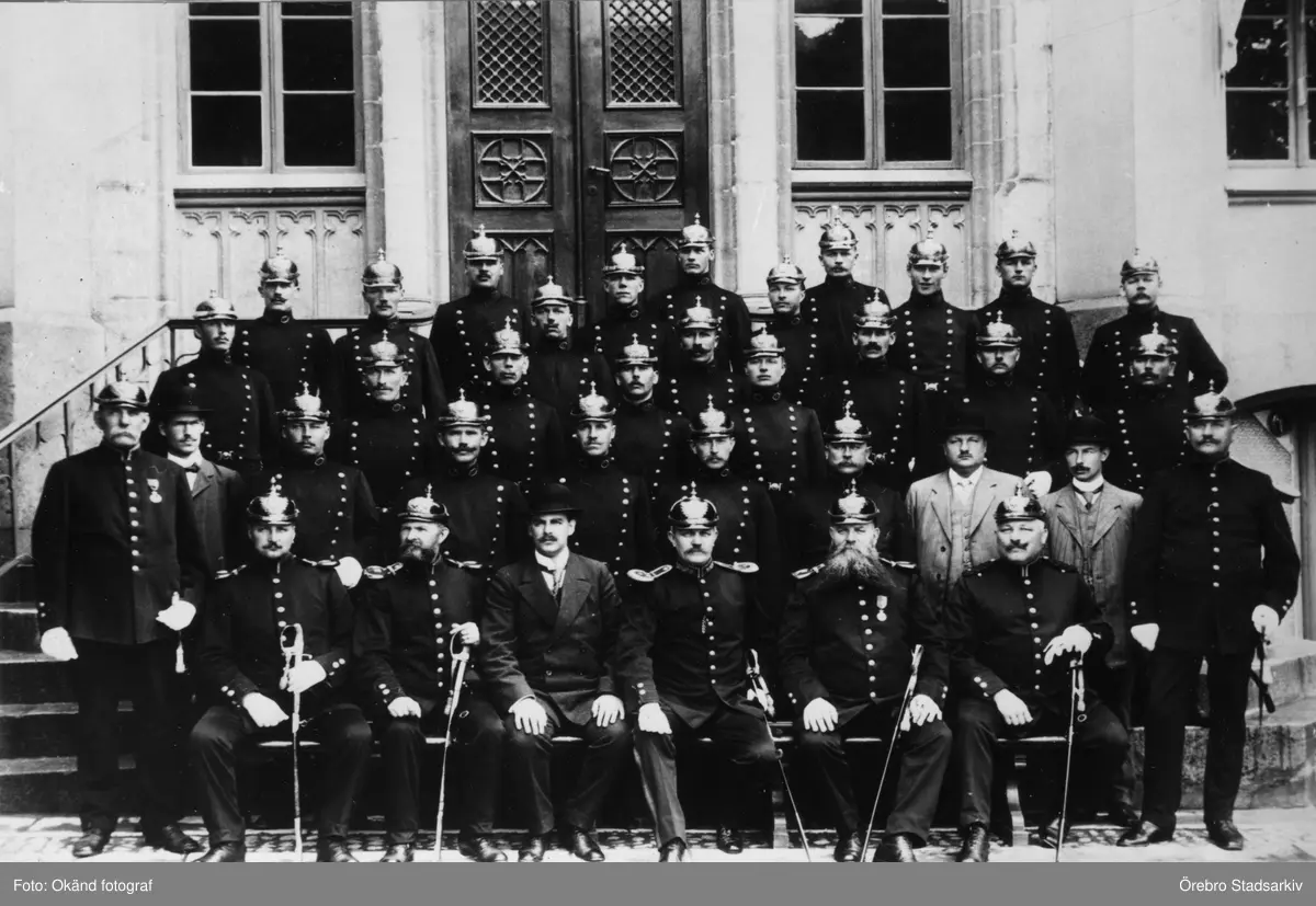 Titel: Gruppfotografi av Örebro poliskår på Rådhusets trappa, 1913