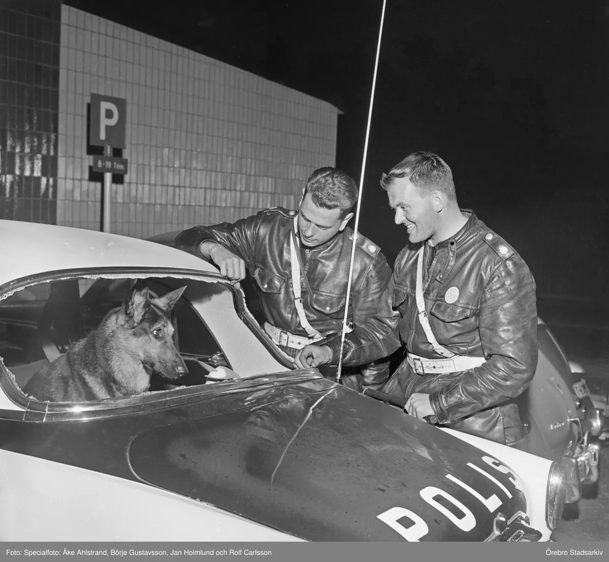 Polishund i sönderslagen polisbil. Gelleråsen, Karlskoga. 1960-08-07