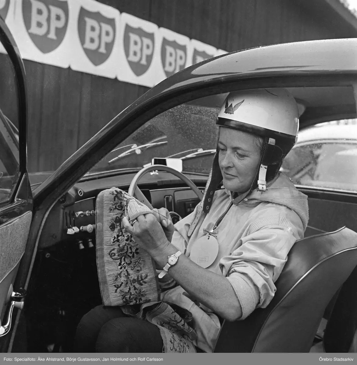 Handarbete och racing hör ihop. Gelleråsen, Karlskoga. 1960-08-07