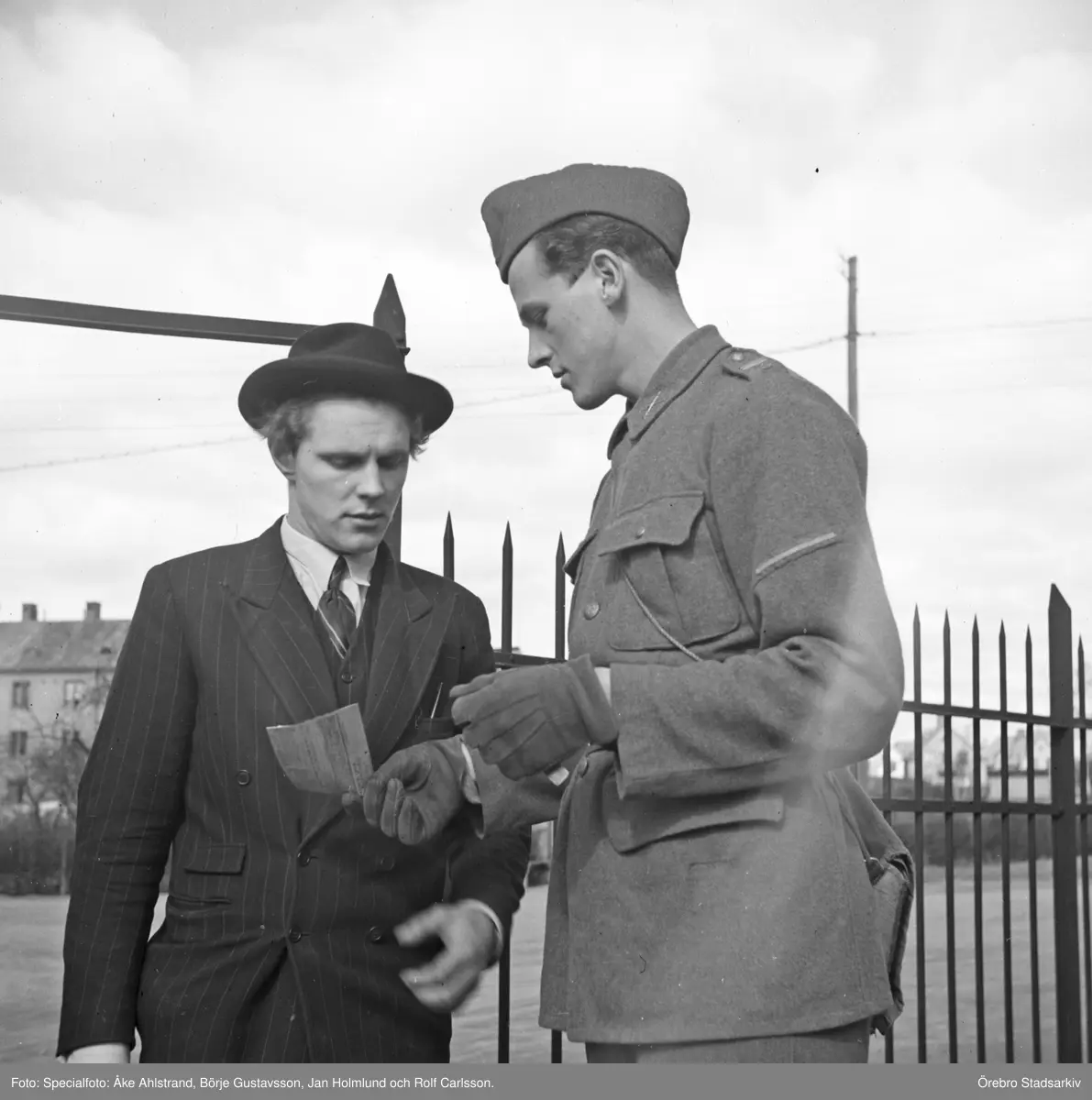 Passerkontroll av ny rekryt på I3, Grenadjärstaden, 1946-04-08