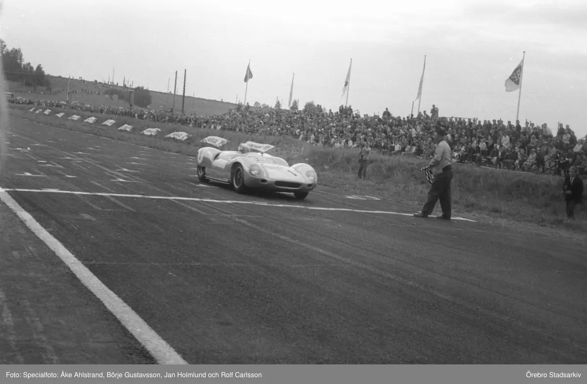 Stirling Moss går i mål på Gelleråsen, Karlskoga. 1960-08-07