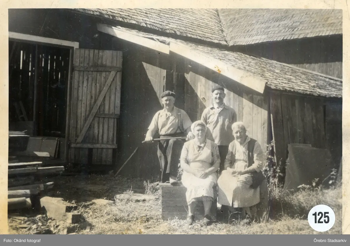 Grupp vid ladugård i Valltorp, Frövi, 1950-tal