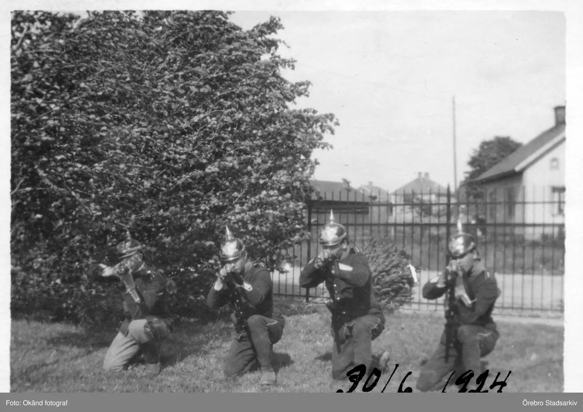Vakter siktar mot kameran på Svea Trängkår, Älvtomtagatan, 1924