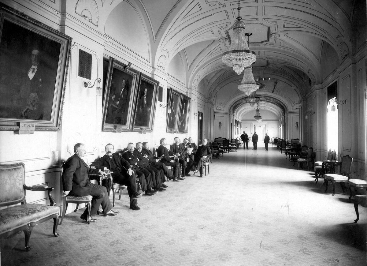 Korridoren mellan första och andra kammaren, 1906. Närmast åskådaren A F Jansson i Bråten och Öberg från norra Ångermanland
