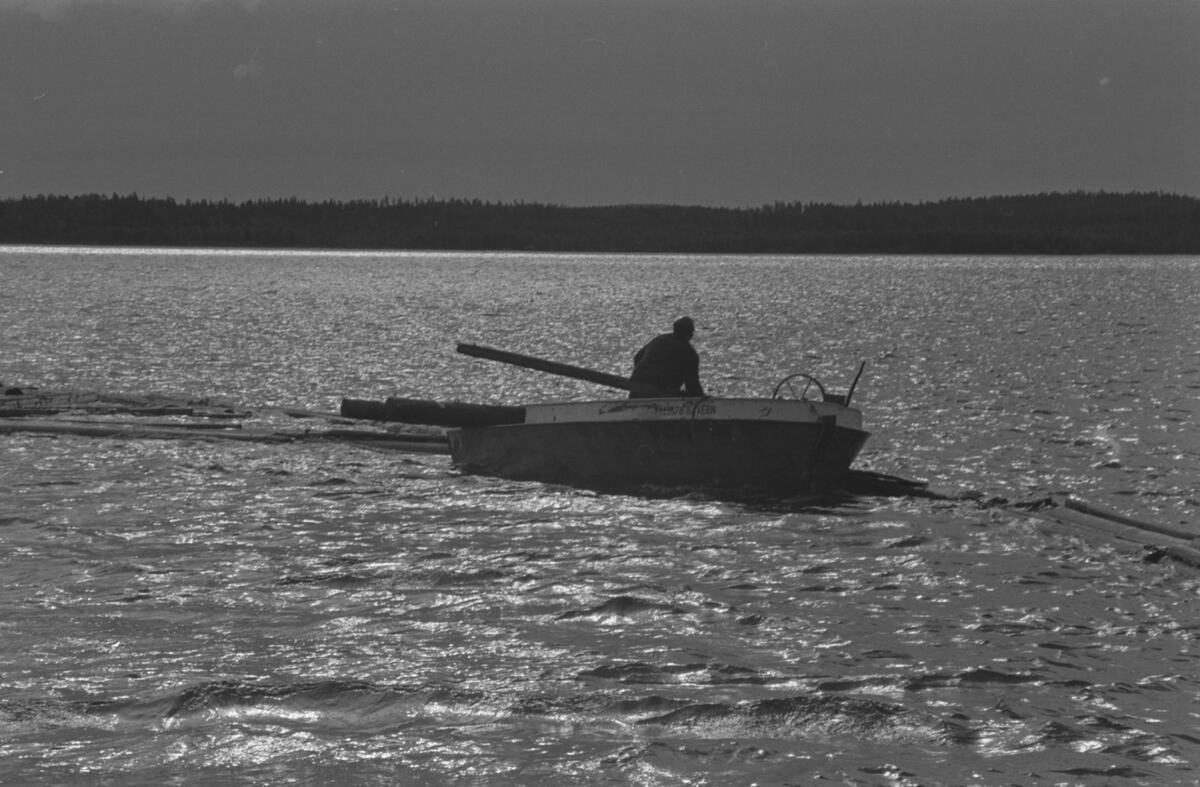 Tullingsåsen. Tryggve Persson lyfter upp stocken som hamnat utanför fraktbommen, för att sen skjuta in den i noten.