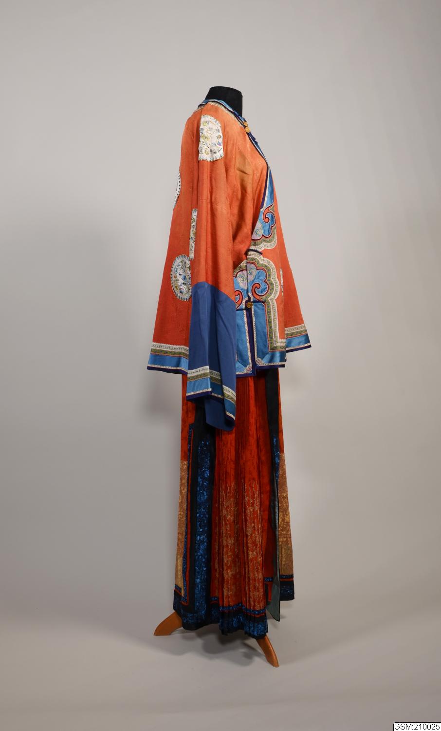 Kinainspirerad teaterkostym bestående av jacka och kjol i rödorange siden med applikationsteknik.
