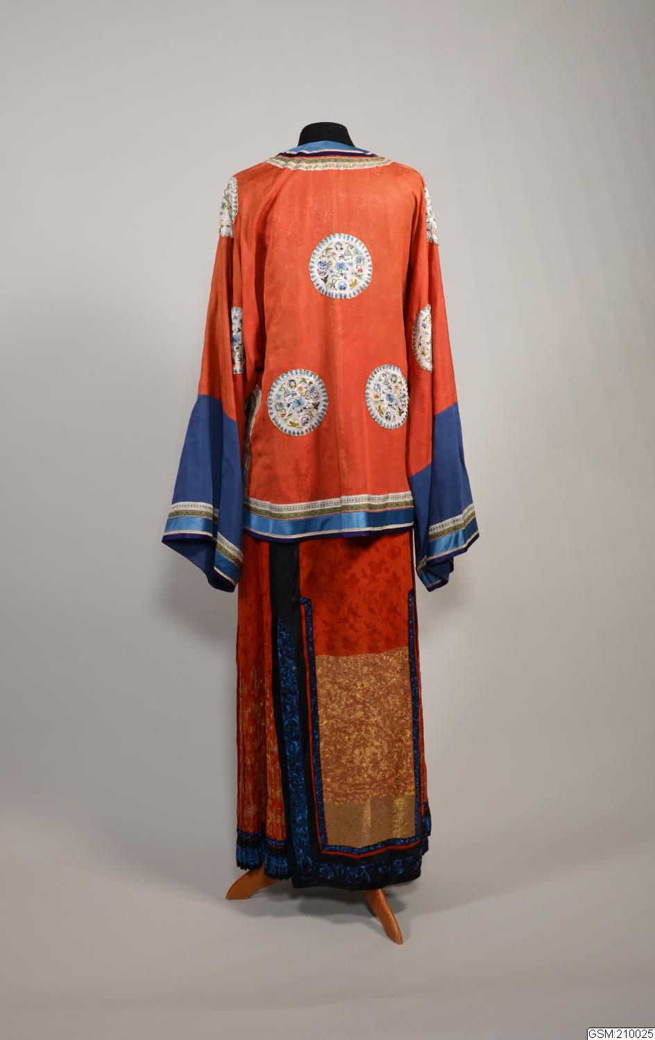 Kinainspirerad teaterkostym bestående av jacka och kjol i rödorange siden med applikationsteknik.