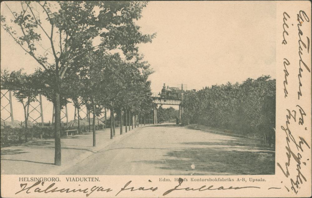 Vykort i papper. På framsidan ett svartvitt fotografi föreställande järnvägsviadukten vid Gröningen. Handskriven text under och vid sidan om motivet.