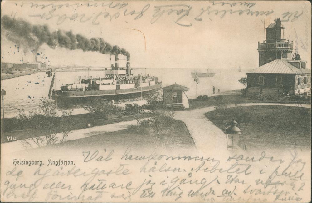Vykort i papper. På framsidan ett svartvitt fotografi föreställande lotsstationen och en ångbåt. Handskriven text över och under motivet.
