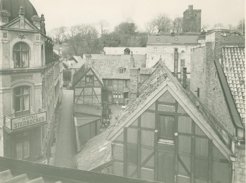 Svartvitt fotografi föreställande Strömgränden och en del av kvarteret Strömkarlen i Helsingborg. Kärnan syns i bakgrunden. På vänster sida finns en skylt "Hotell Stenbocken"