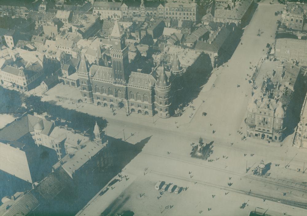 Svartvitt fotografi föreställande stortorget och hamntorget. Bilden är tagen uppifrån.
