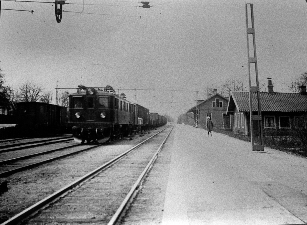 Floby station. Flyttad 1867 från Gerarp i Sörby, men behöll namnet Sörby tills 1912. Huset med gaveln mot perrongen var det gamla stationshuset från Gerarp som här blev stinsbostad. Det "nya" hade från början stått i Laxå. Foto från 1926 då eldriften togs i bruk.