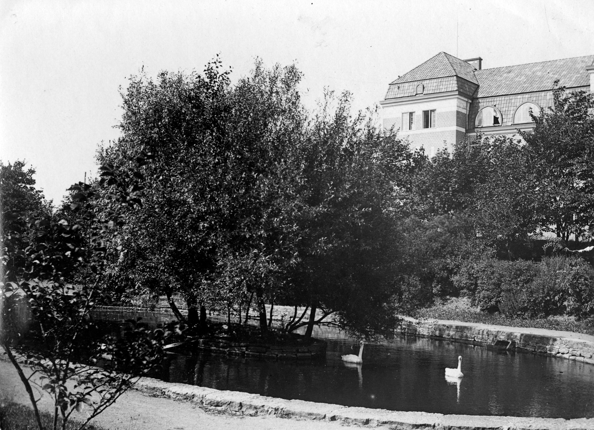 Svandammen i Plantis, i bakgrunden samskolan (sedermera Kyrkerörsskolan).
