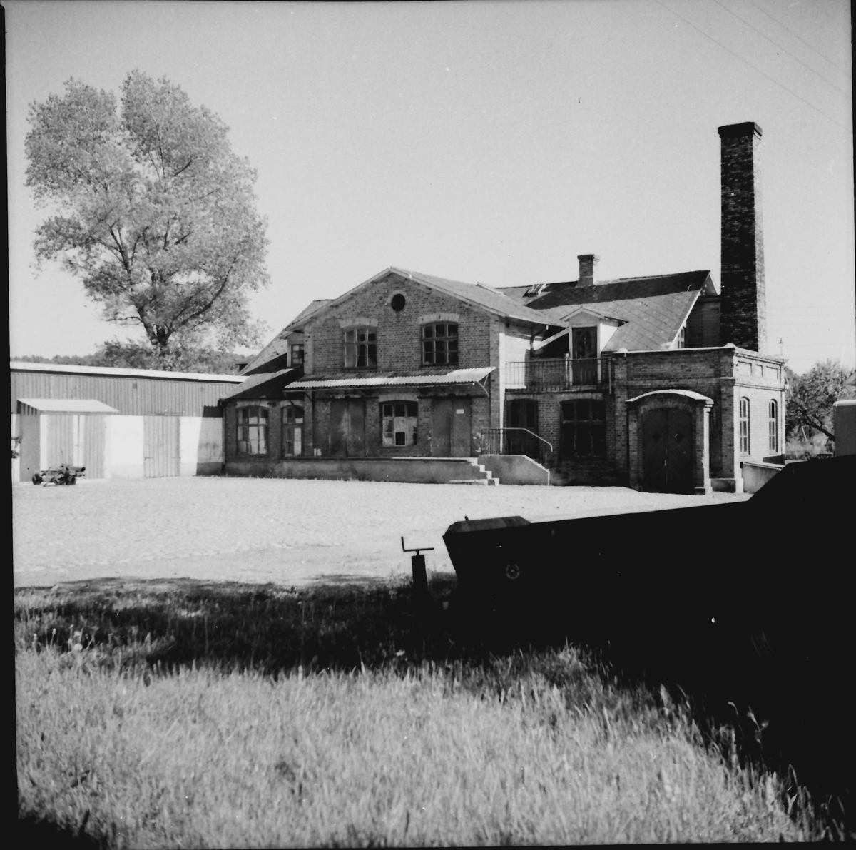 Veddige mejeri sett från gården. Byggnaden är av tegel med pilastrar, gesims, stickbågade spröjsade fönster och en hög skorsten.