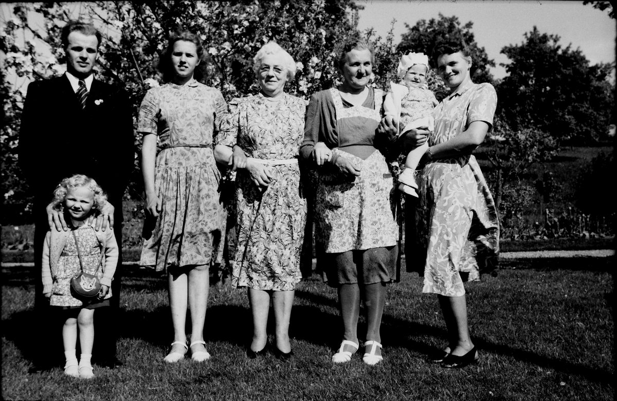 En samling människor står i solen i trädgården på Stora Ry med blommande buskar och lökväxter i en rabatt längs grusgången. Personerna är enligt bildförteckningen från vänster: Åke Johansson med dotter Eivor, som har en väska med en katt på, Signe, troligen någon som hälsar på från Amerika, Gerda och Linnea med dotter Solvig på armen.