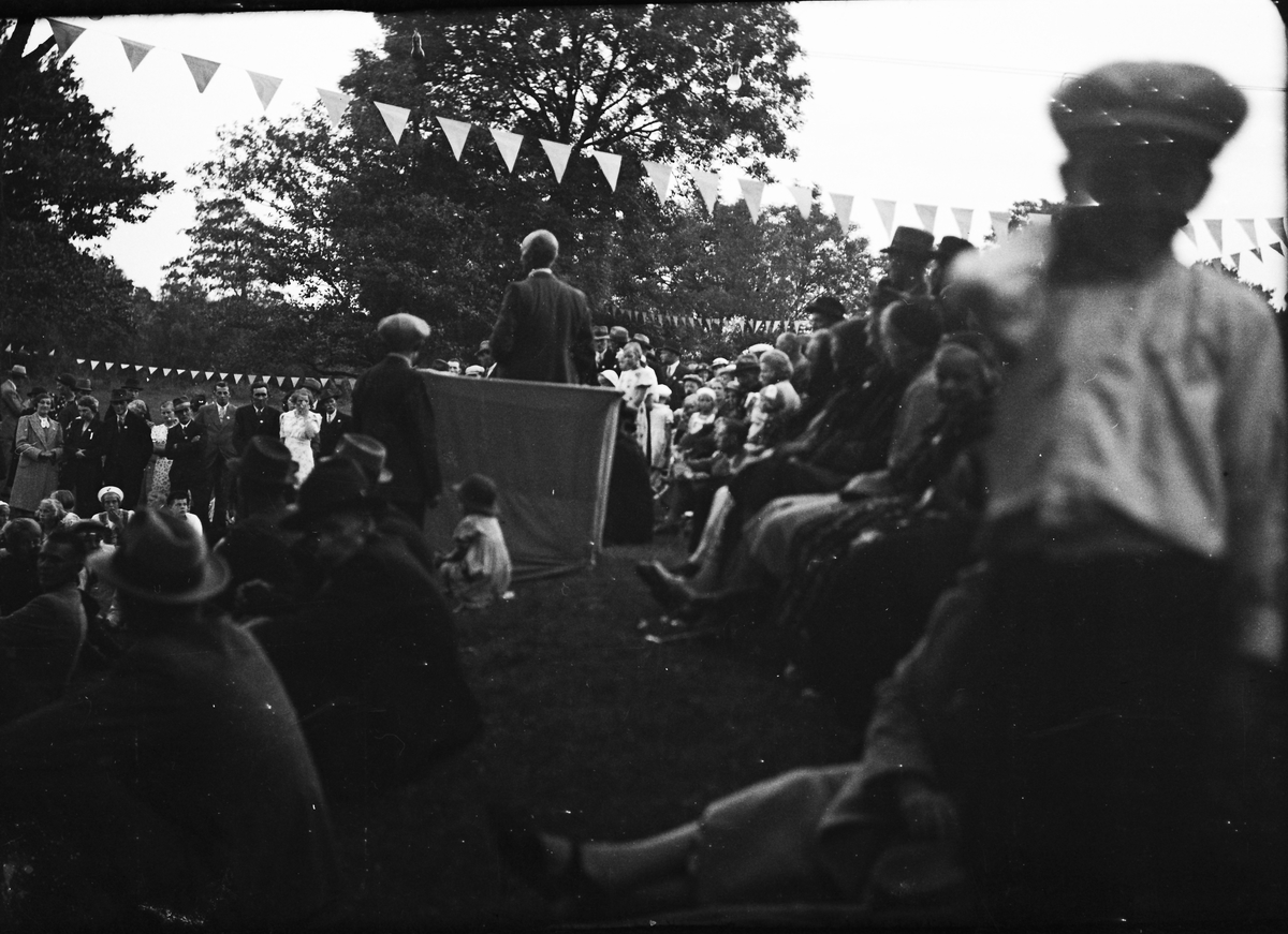 Kommunalpolitikern och folkskolläraren Oscar Broborg talar på festplatsen i Kalvhult, Veddige. Han anlade i Fullsbäcken även en botanisk trädgård och "plats för gammal allmogekultur" som han kallade det.